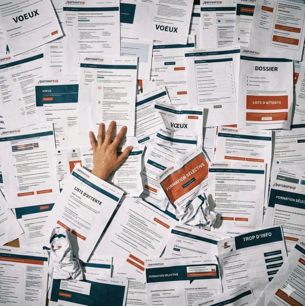 60% des lycéens se disent "fortement stressés" par Parcoursup. L'an dernier, 103 000 candidats se sont retrouvés sans aucune proposition.Le problème n'est pas le manque d'informations: au contraire, Parcoursup te donne les données. Les profs te donnent des conseils. Mais personne ne t'aide à traiter cette montagne d'infos et à structurer ta réflexion.→ Les conseillers d'orientation sont débordés : 1 pour 1 500 élèves.